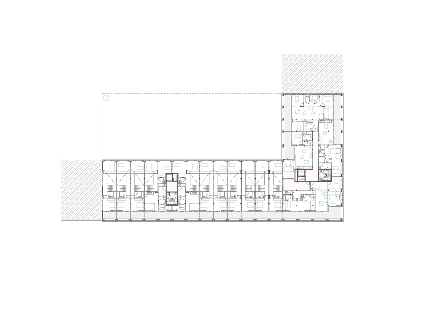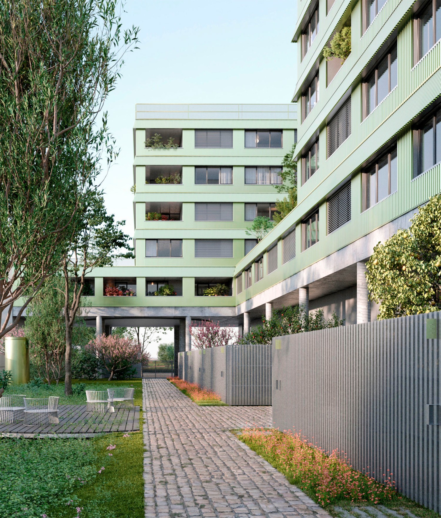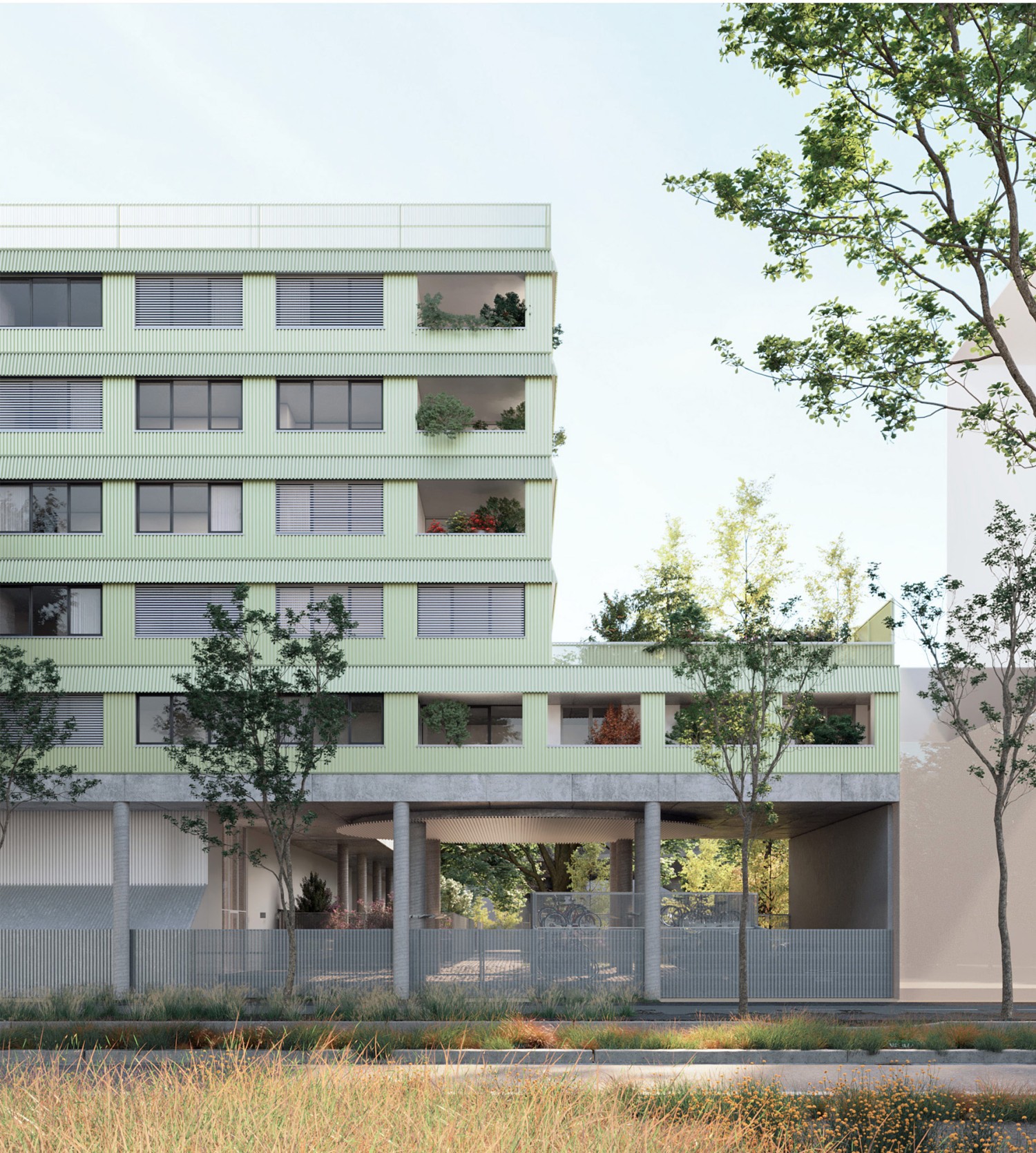 La torre O’Higgins 1625 busca integrar las dos tradiciones mediante el apilamiento de viviendas envueltas en galerías ajardinadas, que reproducen la misma secuencia que ofrecían las casonas antiguas. Una envolvente ligera y reflejante retoma el orden visual de los primeros muros cortina del barrio, ahora superpuestos a una vegetación abundante que desplaza los cristales hacia el interior de la planta, modificando radicalmente la percepción del conjunto.