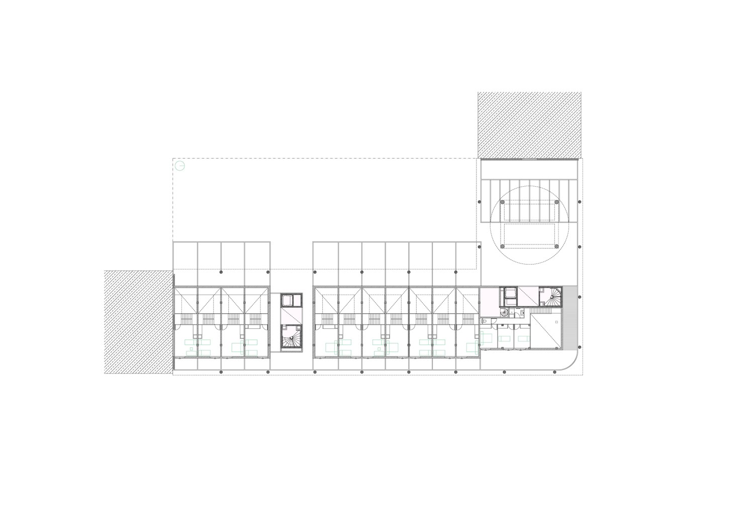 La segunda parte comprende el diseño de los edificios de servicio y que han de servir a los trabajadores. La propuesta radica en dibujar un límite conformado por una serie de galerías, las cuales componen distintos vacíos que han de ser ocupados por edificios y patios.