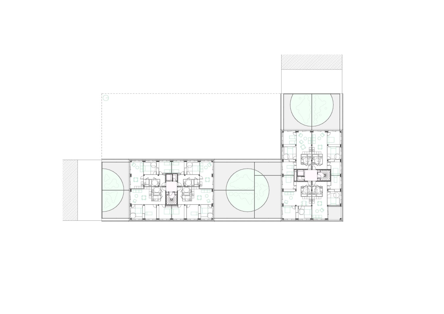 El proyecto se encuentra en el límite noreste de la Ciudad Universitaria de Paris-Saclay, justo en el momento donde el campus se enfrenta con el paisaje agrícola. El solar ocupa un cuarto de la superficie de una manzana irregular, delimitada por una nueva línea de tren, un paseo peatonal y un bulevar próximo a la carretera que conecta con el centro de Paris. El proyecto propone un gran jardín que aleja a las viviendas de las vías del tren, consolidado su perímetro sobre los otros bordes. Al encontrarse con el bulevar, la planta baja se libera formando un espacio semicubierto de gran tamaño que vincula el jardín interior con el campo. Al entrar en contacto con el suelo del paseo peatonal, en cambio, se organiza una hilera de viviendas en tríplex con acceso directo desde el espacio público y desde el jardín interior. En el estrato superior, un basamento conectado a dos torres de madera y núcleo de hormigón agrupa al resto de las viviendas. Las esquinas de las torres cuentan terrazas profundas y abiertas en dos direcciones, acercando los matices de la atmósfera a la vida doméstica.
