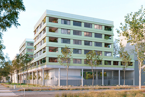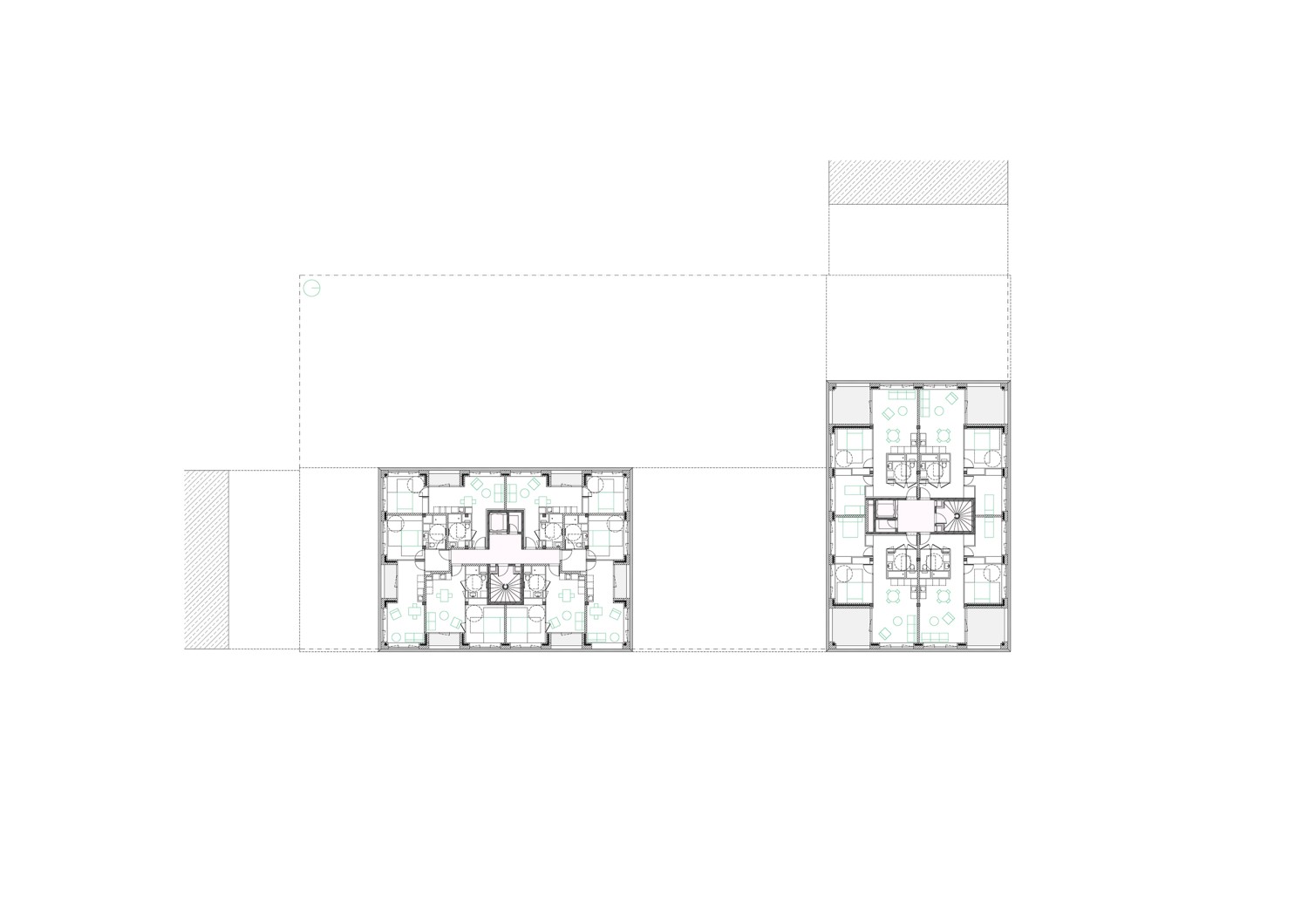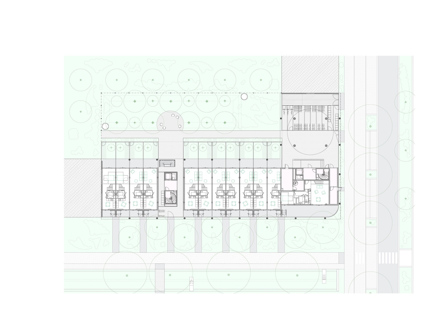The project is located on the northeastern edge of the Université Paris-Saclay, right where the campus faces the agricultural landscape. The site occupies a quarter of the surface of an irregular block, delimited by a new train line, a pedestrian promenade and a boulevard next to the road that connects with the center of Paris. The project proposes a large garden that distances the housing units from the train tracks, consolidating its perimeter on the other two edges. Upon meeting the boulevard, the ground floor is liberated, forming a large semi-covered space that links the interior garden with the production field. When meeting the pedestrian promenade, however, a row of triplex homes is organized with direct access from the public space and from the interior garden. In the upper stratum, a plinth connected to two wooden towers with concrete core, groups the rest of the homes. The corners of the towers have deep terraces that bring the nuances of the atmosphere closer to domestic life.